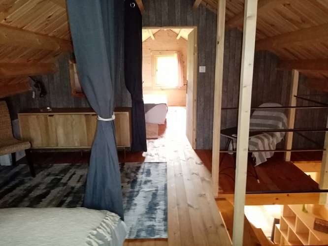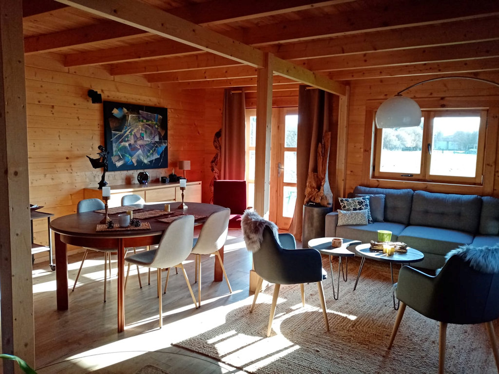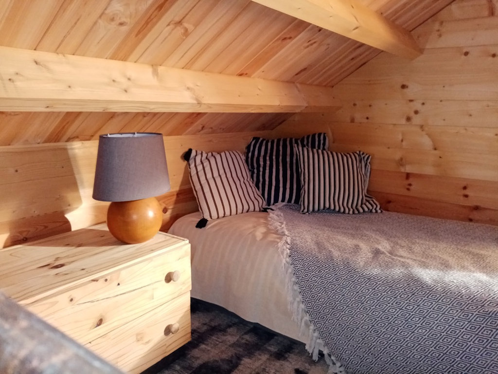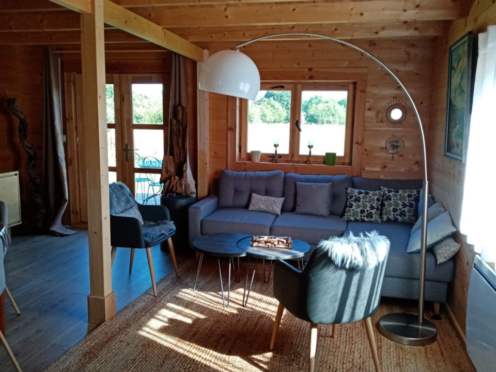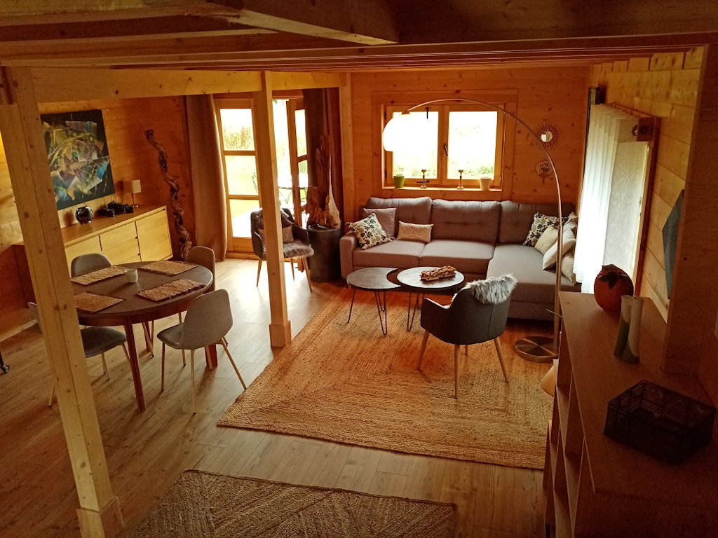 Cette construction bois sur son jardin privatif se compose d'une grande pièce de vie de 45m2 avec cuisine ouverte et équipée, donnant sur une terrasse en bois et le jardin. Elle comporte un coin salon avec canapé d'angle et fauteuils, d’un coin repas avec table extensible, tv (TNT), lecteur DVD, livres, jeux… Salle de bain avec douche, wc séparés.