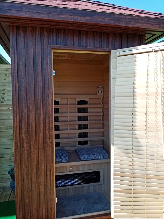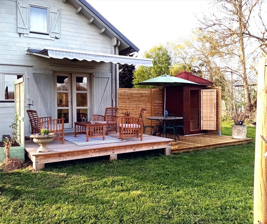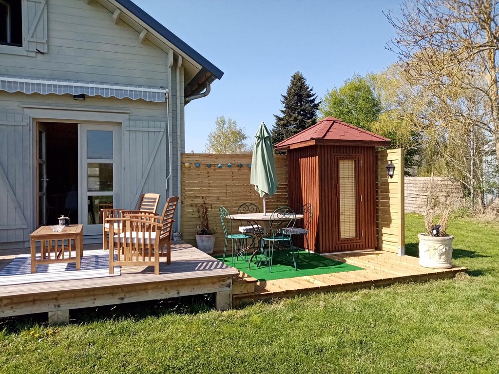 Extérieurs : jardin clôturé, grande terrasse bois avec salon de jardin extérieur,store et sauna privatif à infrarouges (en option), table et chaises, barbecue....Vous bénéficiez d’un parking privatif et sécurisé devant le gîte. Vue sur la forêt et la nature, le parc est peuplé d'oiseaux sauvages comme les canards, les cygnes, les bernaches...et bien d'autres !