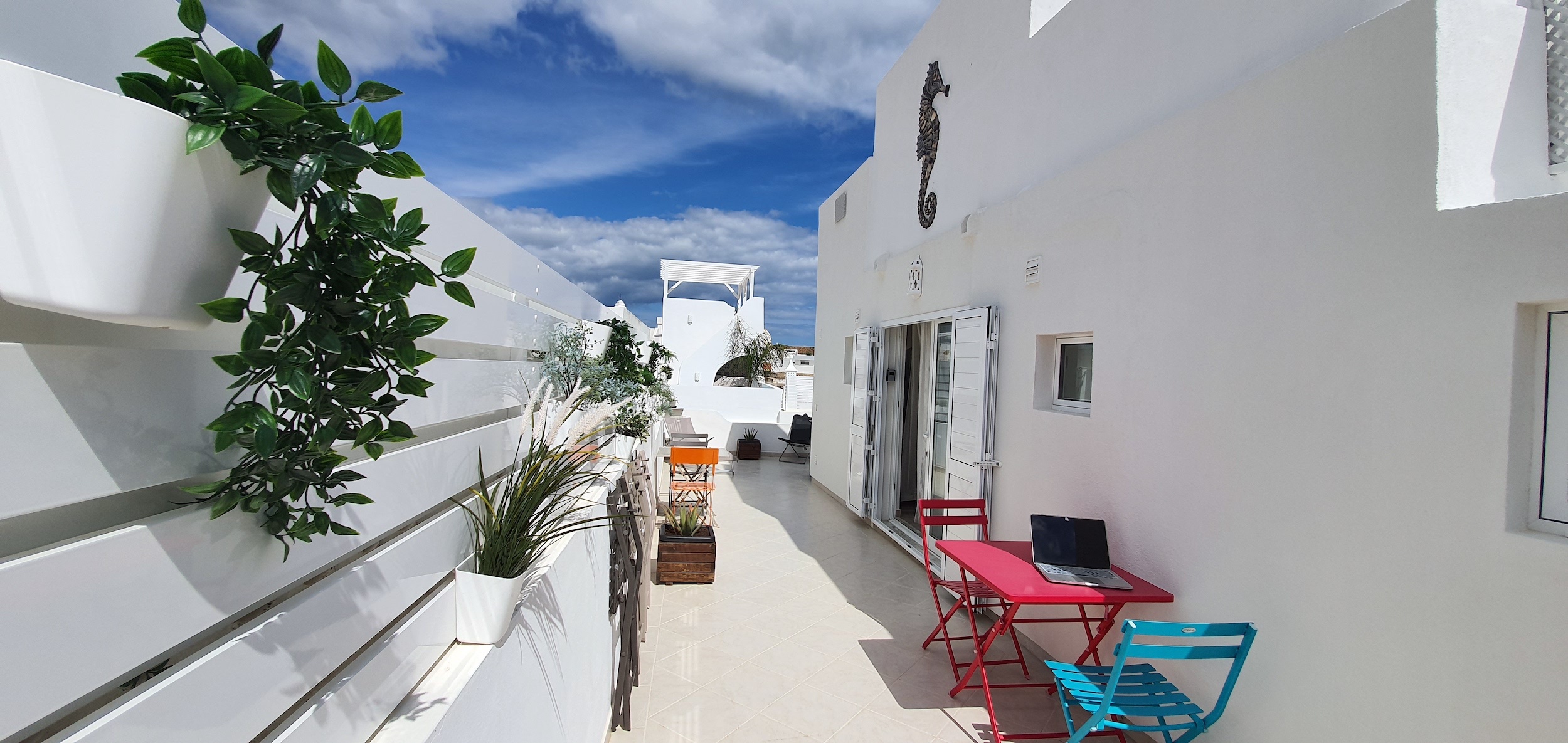 Au 3° et dernier niveau, une petite terrasse intime, où vous pourrez vous isoler pour contempler les toits-terrasses des maisons cubiques.