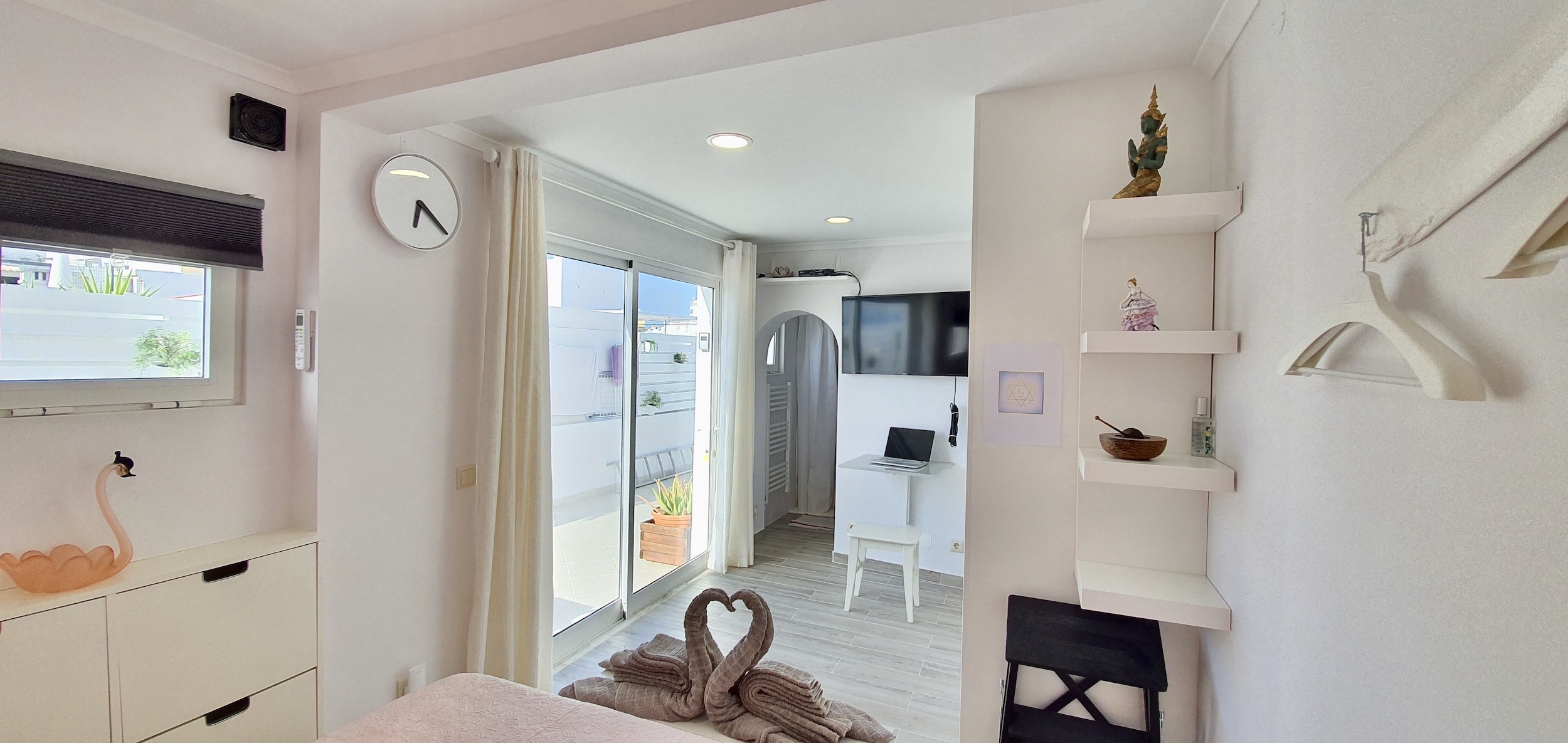 la Casinha, suite avec TV, lit Queen Size, salle d'eau, petit coin tout équipé pour petit déjeuner, wc, une baie vitrée qui donne sur une terrasse.