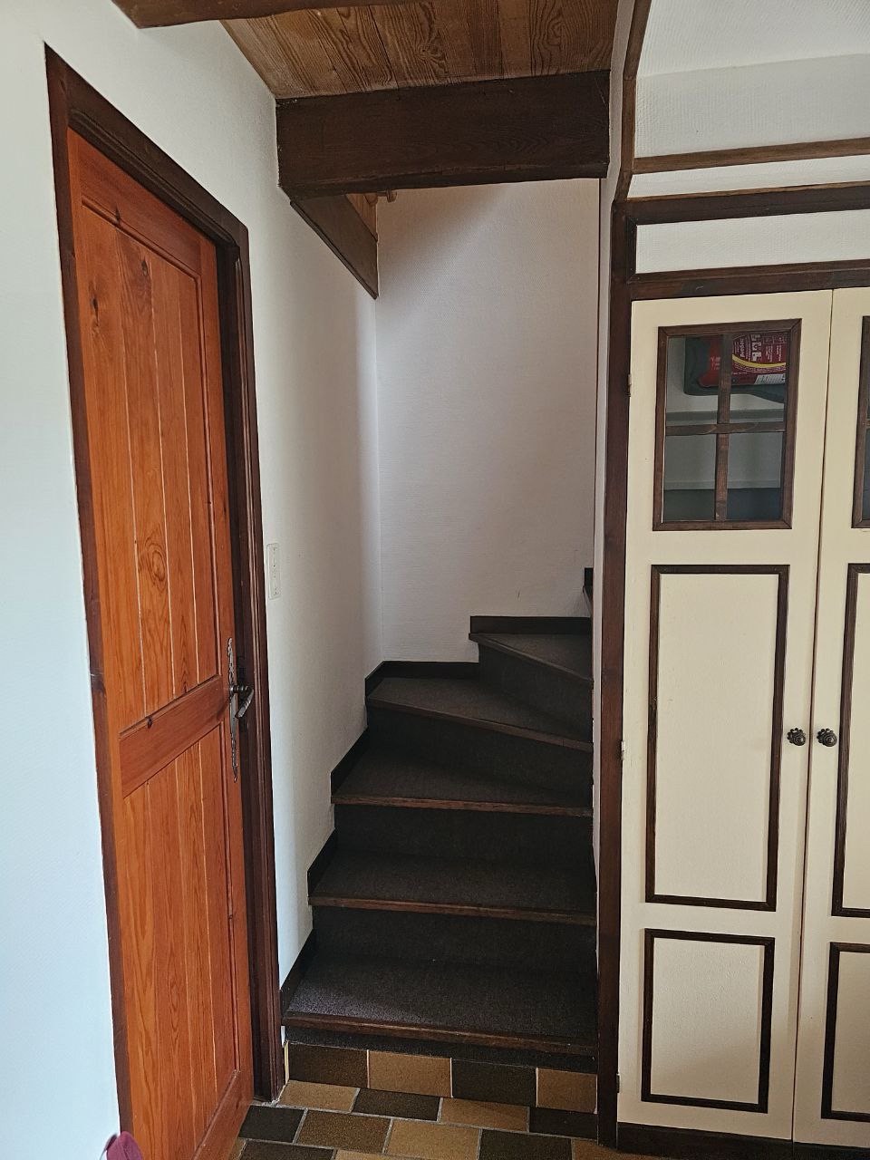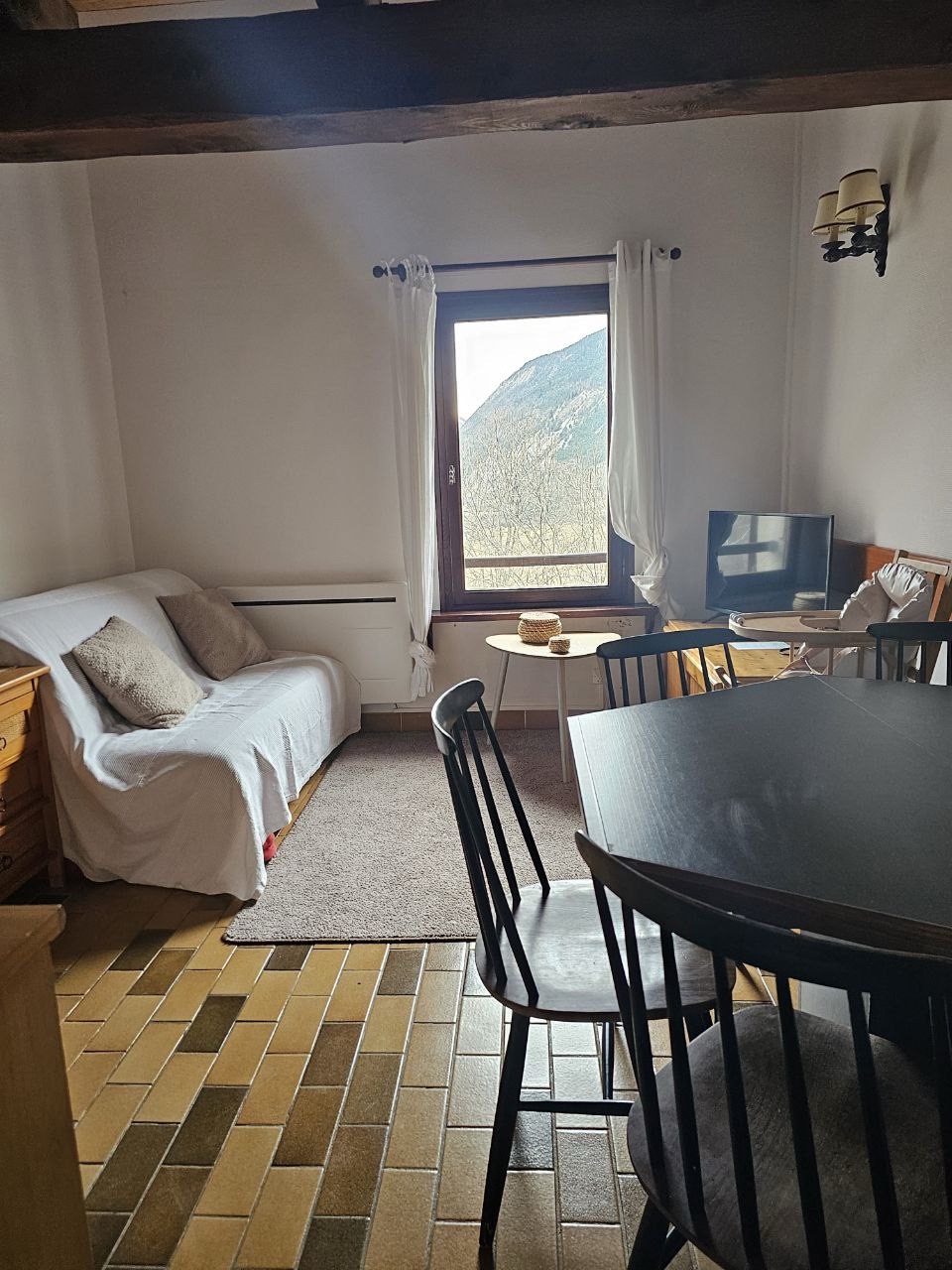 Ce chalet comprend un séjour et une cuisine ouverte, 1 canapé convertible, 1 télévision, 1 placard sous l'escalier.
