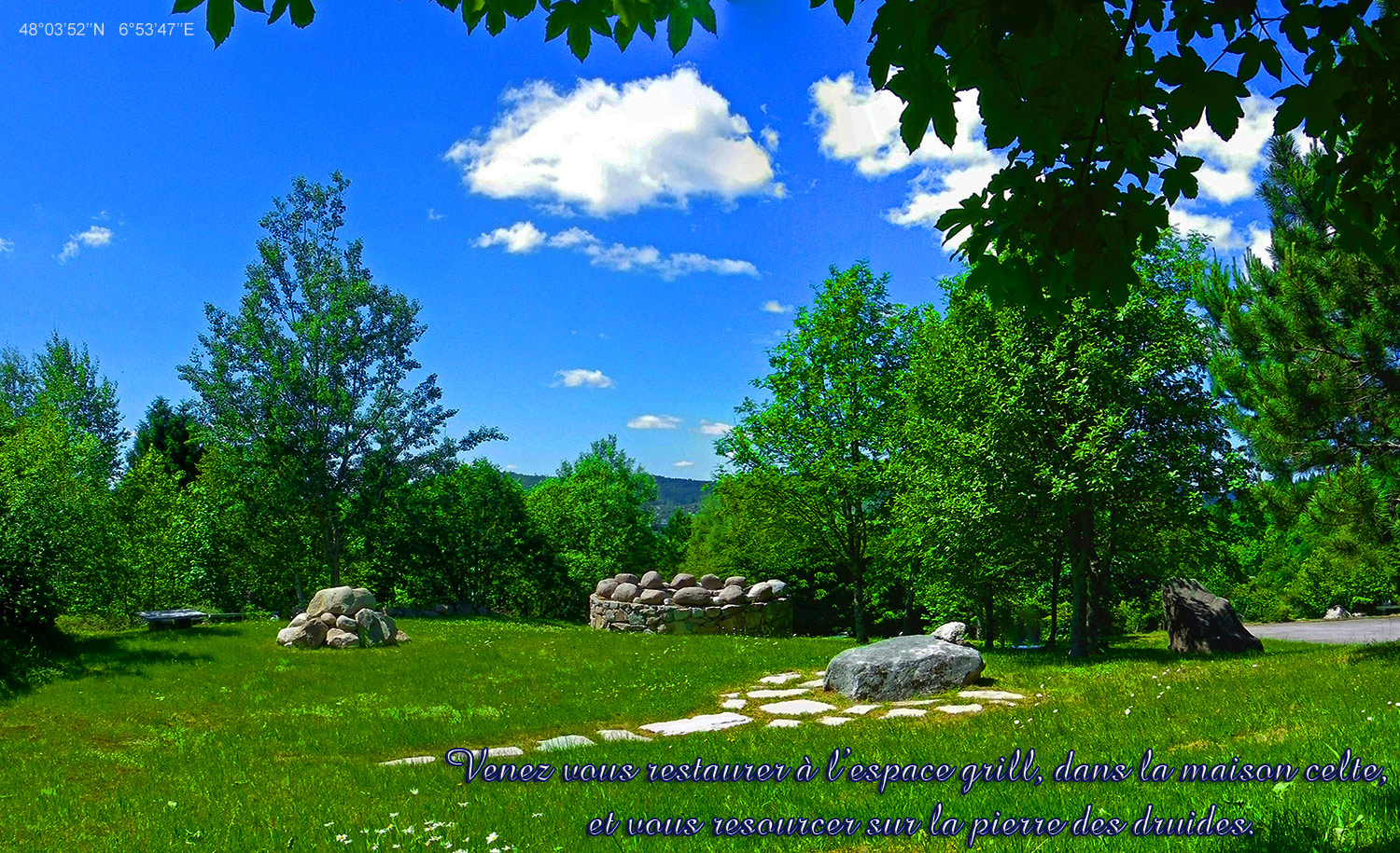 Piscine en eau de source chauffée toute l'année, boulodrome, espace grill, maison Celte, pierre de soin druidique...
