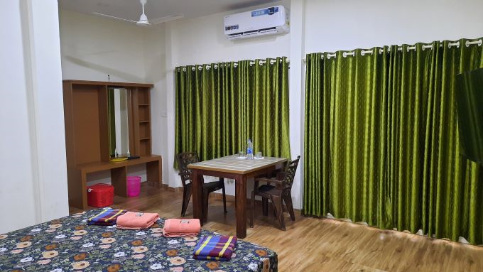 La Double room Deluxe comporte un grand lit double. Elle se trouve au premier étage de la nouvelle maison. Les petits déjeuners préparés par Shameer sont copieux et fruités. Ventilateur au plafond, air conditionné, WC et douche avec eau chaude dans la chambre.