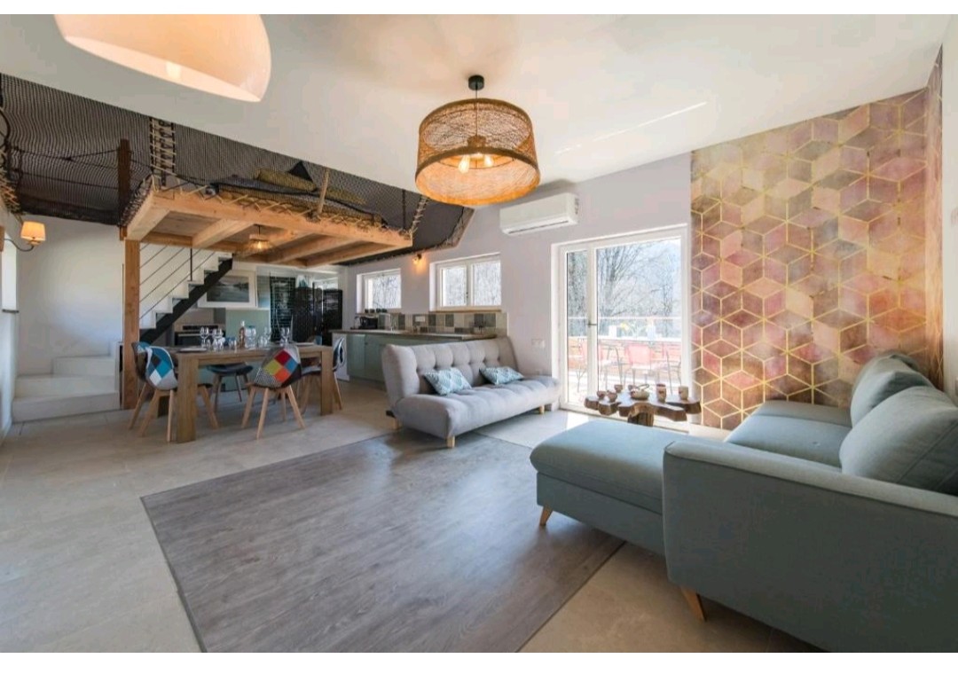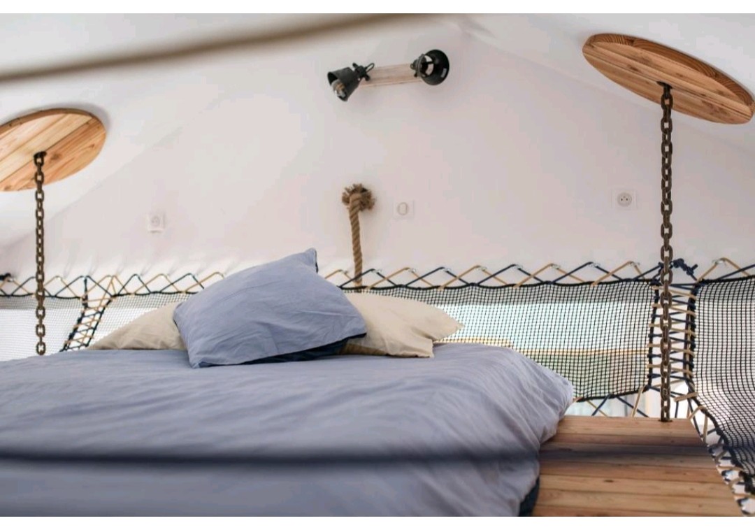 Dans cette maison, vous aurez la particularité de pouvoir dormir dans une mezzanine suspendue par des chaînes de bâteau et de se reposer sur des filets de catamaran!