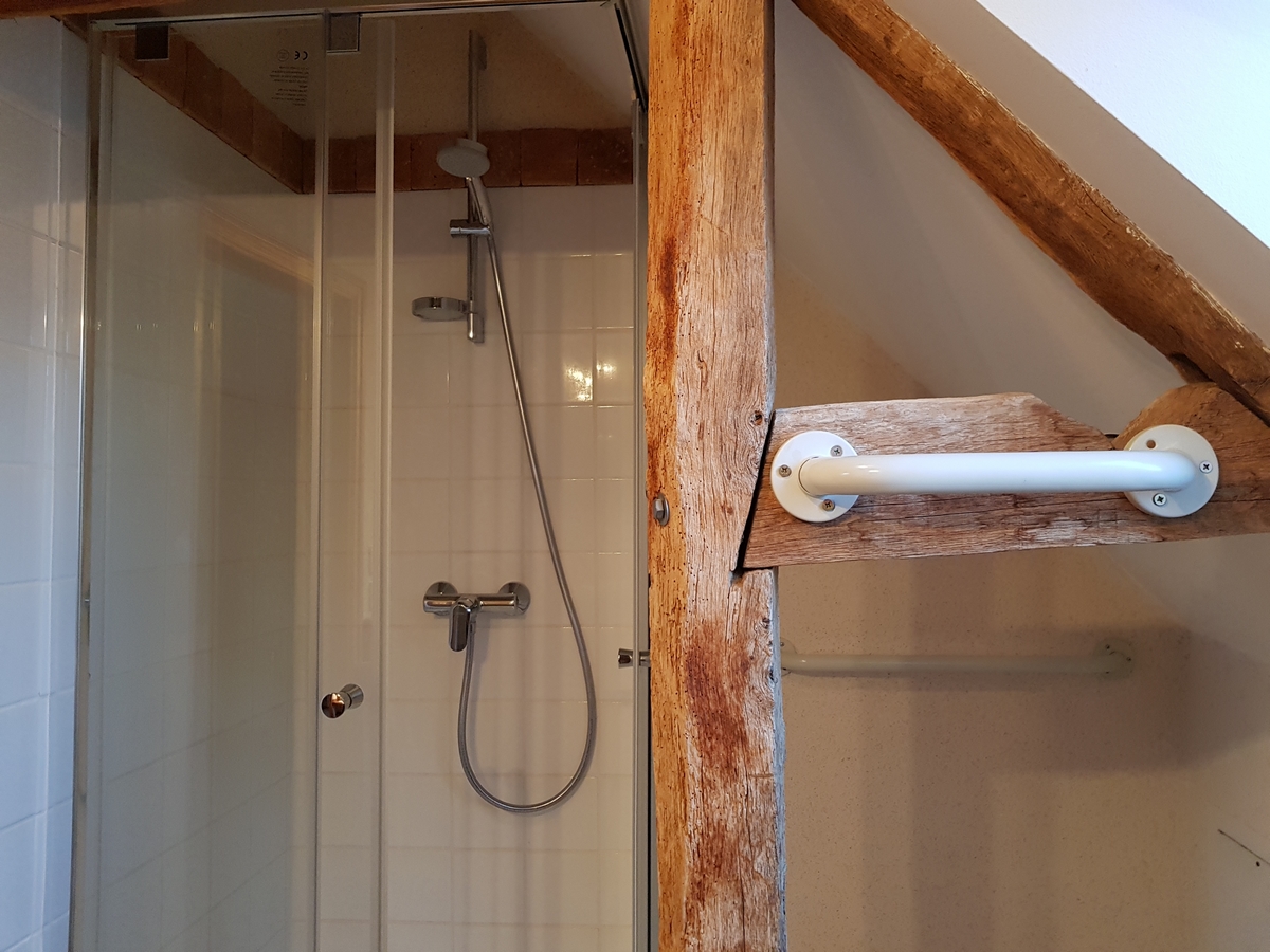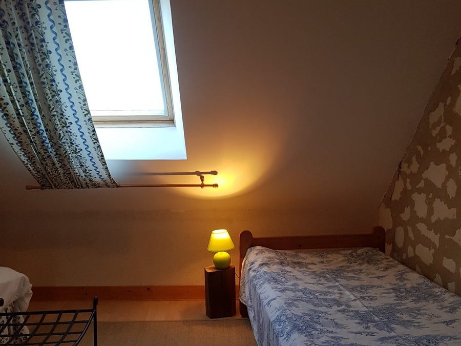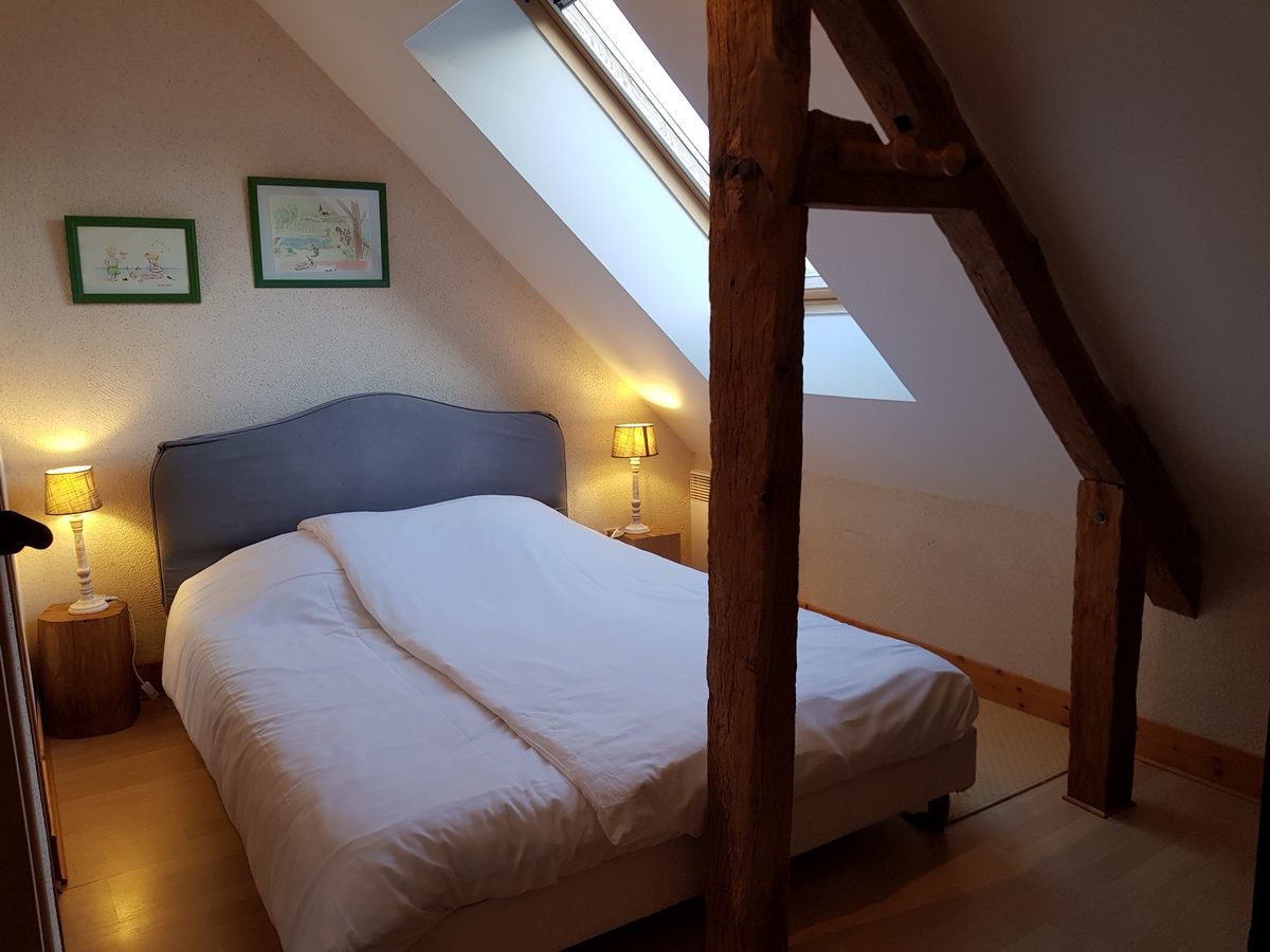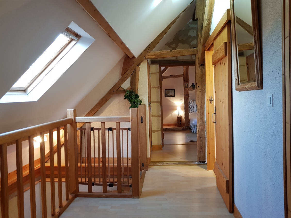 Au 1er étage, un couloir alimente 2 grandes chambres triples, un chambre double, une salle de douche et un WC. Les poutres anciennes ont été conservées et donnent à ce gîte de 132 m² tout son charme.