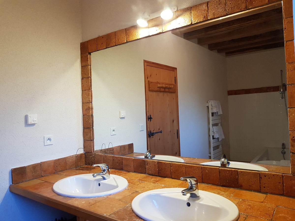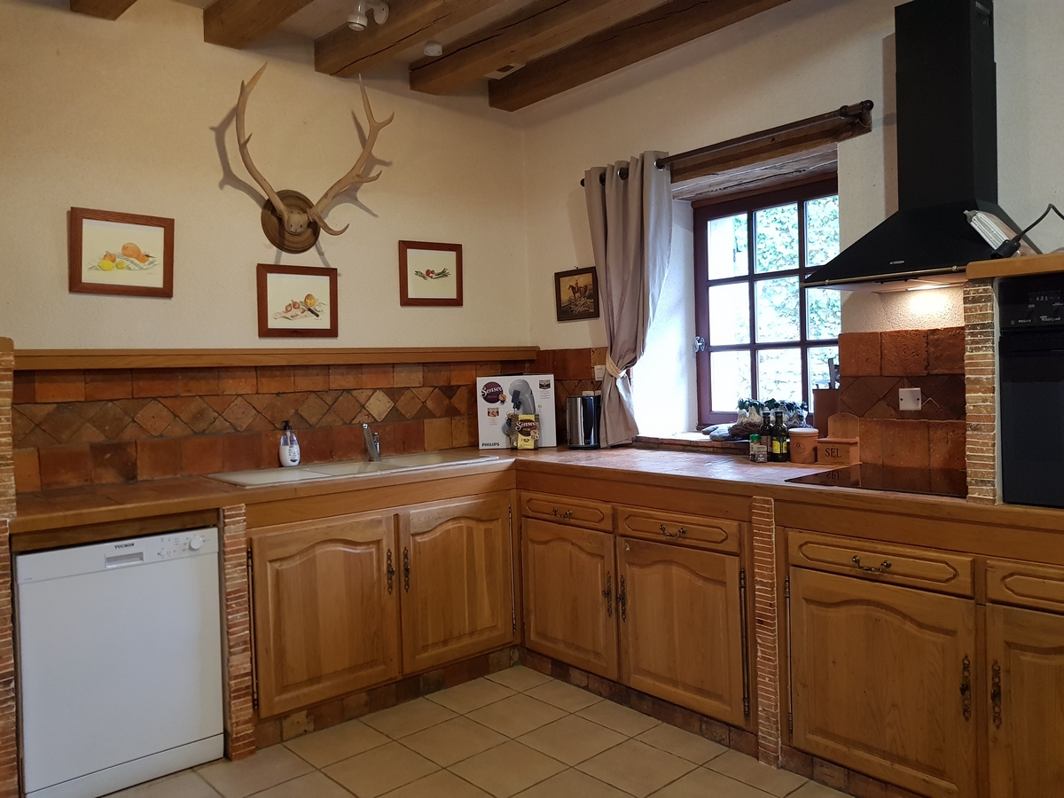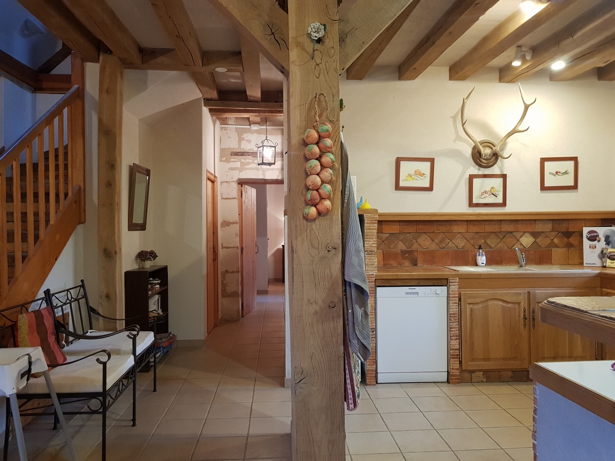 Le séjour comprend un coin salon, cosy avec cheminée, un coin salle-à-manger avec l’ancienne table de la cuisine du château, datant du XVIe et une cuisine ouverte toute équipée, avec un plan de travail recouvert par de jolies tomettes anciennes.
