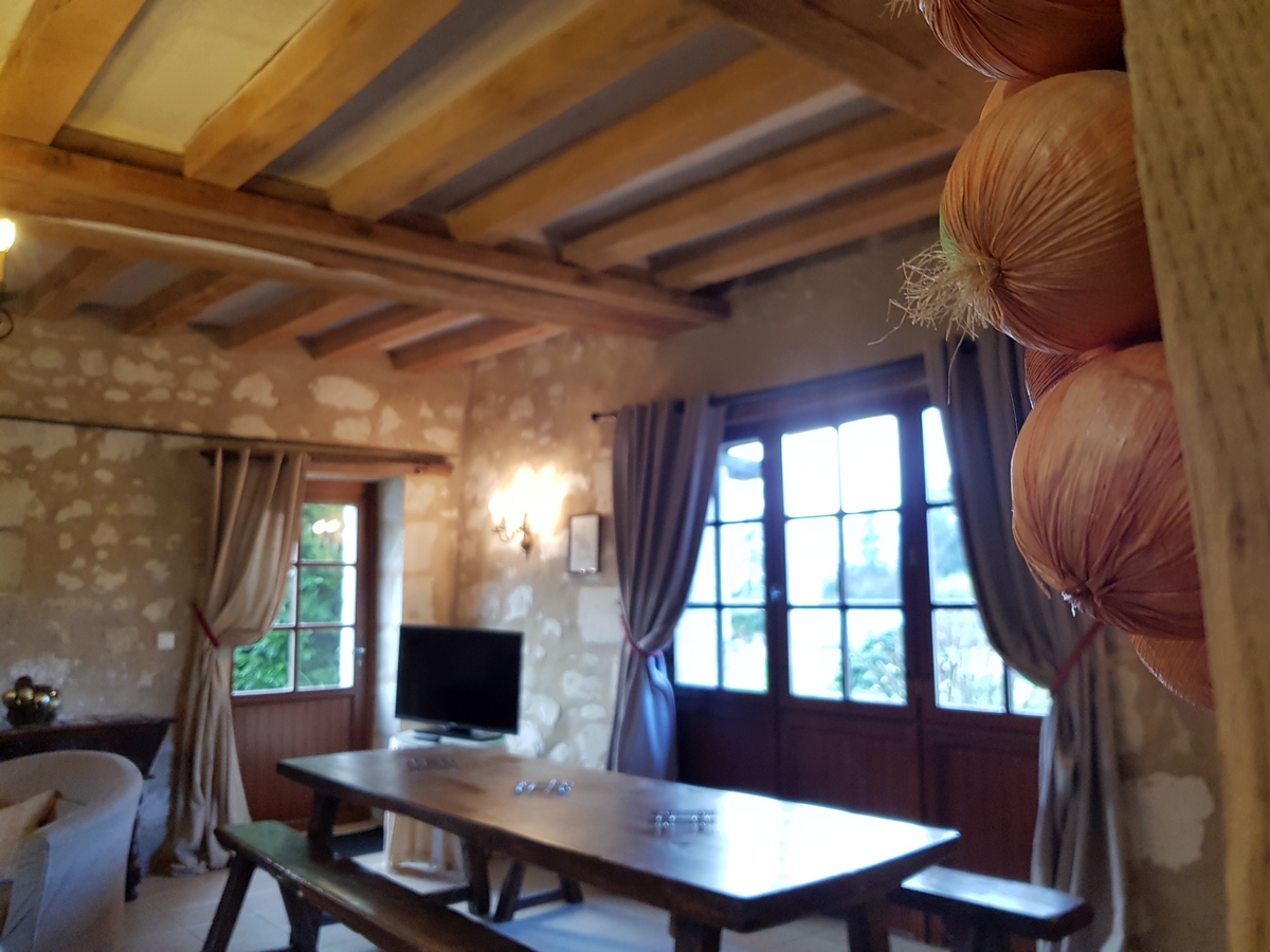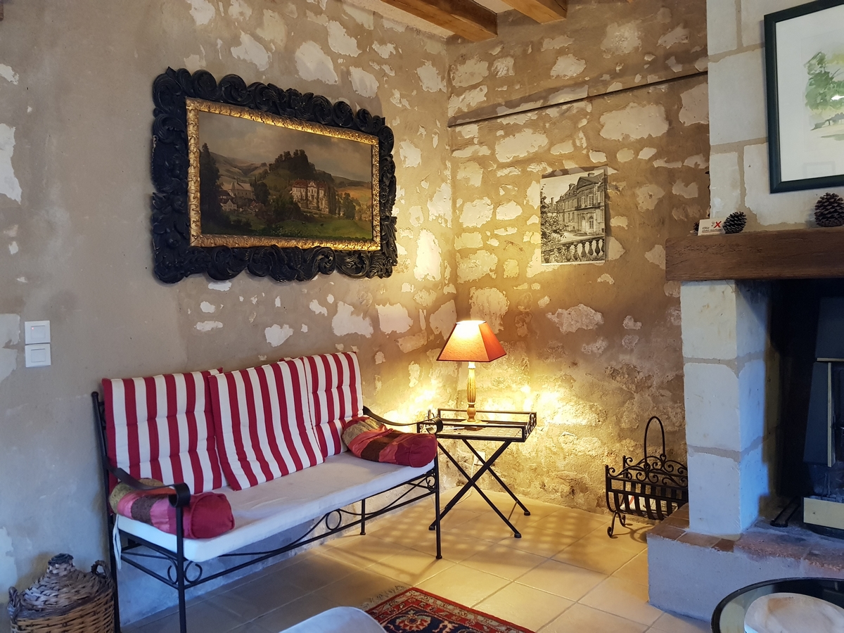 Un vaste séjour de 55 m² occupe une grande partie du Rez-de-chaussée du gîte « Le Pressoir » ****. Cette pièce de vie lumineuse, profite du soleil matinal et offre une belle vue sur le château. Tous les murs sont en tuffeau, conservant bien la fraîcheur en été.