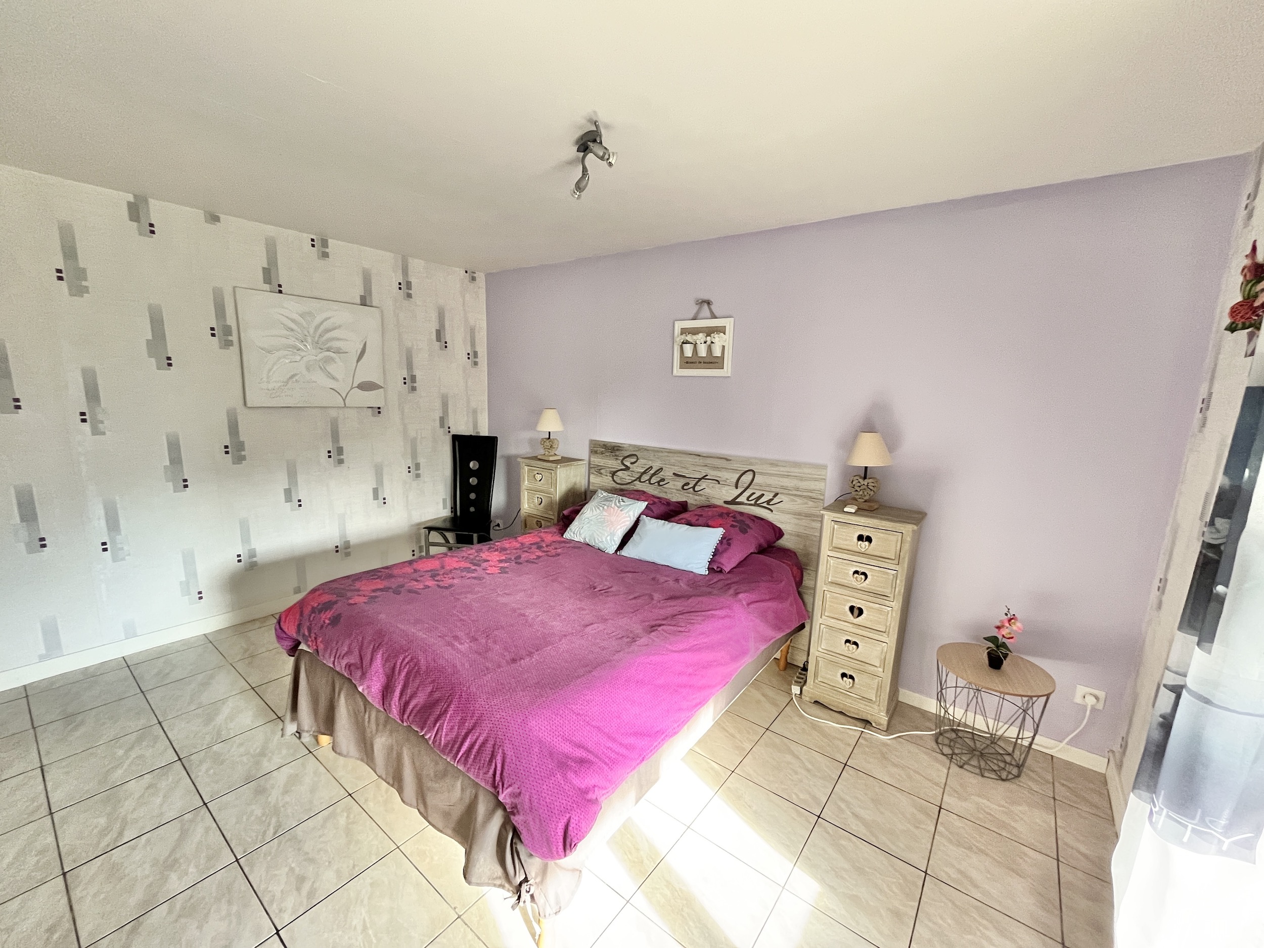 La chambre améthyste de 15 m2 a une capacité de 2 personnes avec 1 lit double de 140 cm et une salle d'eau privative. Les toilettes sont communes.
