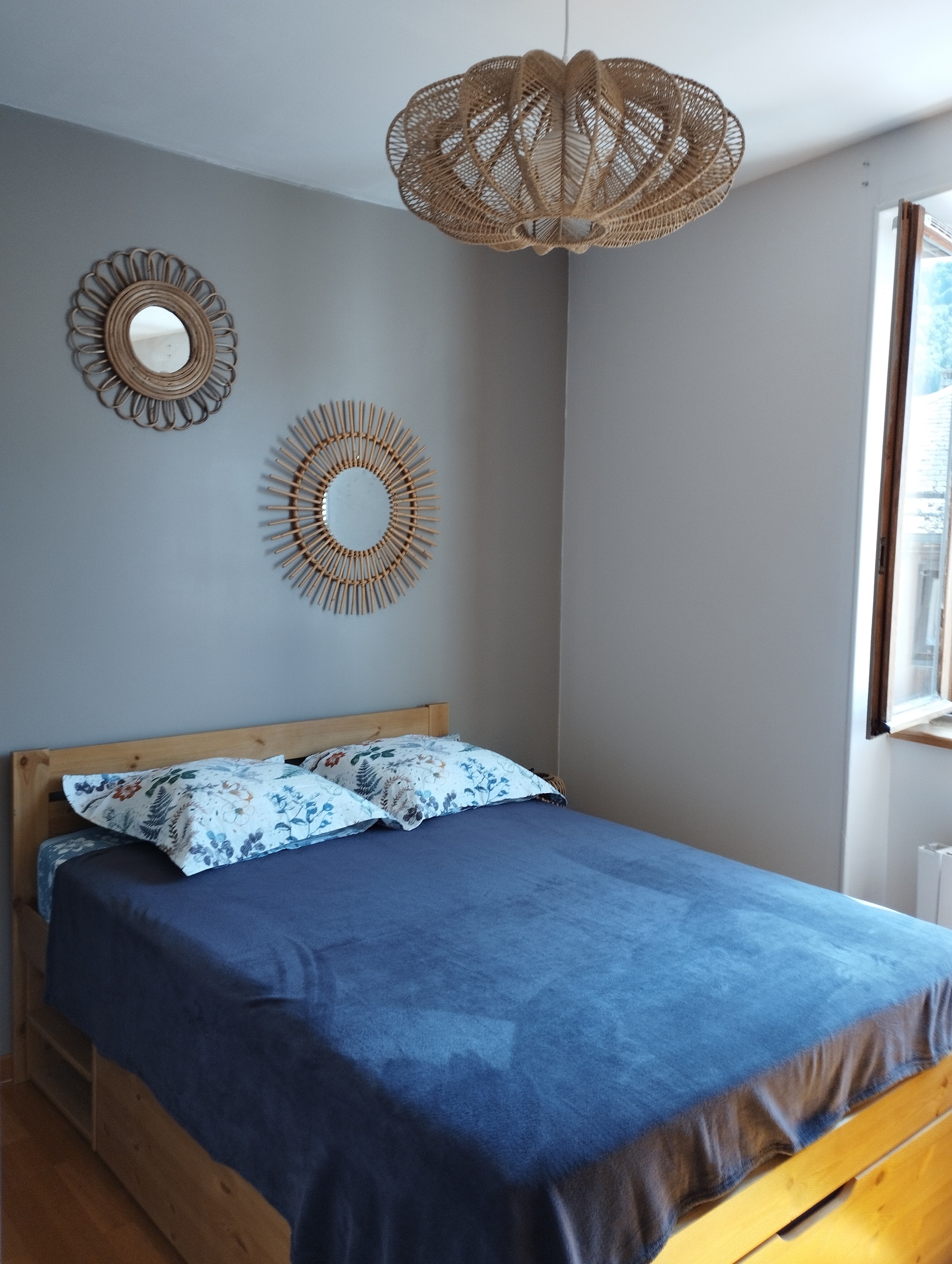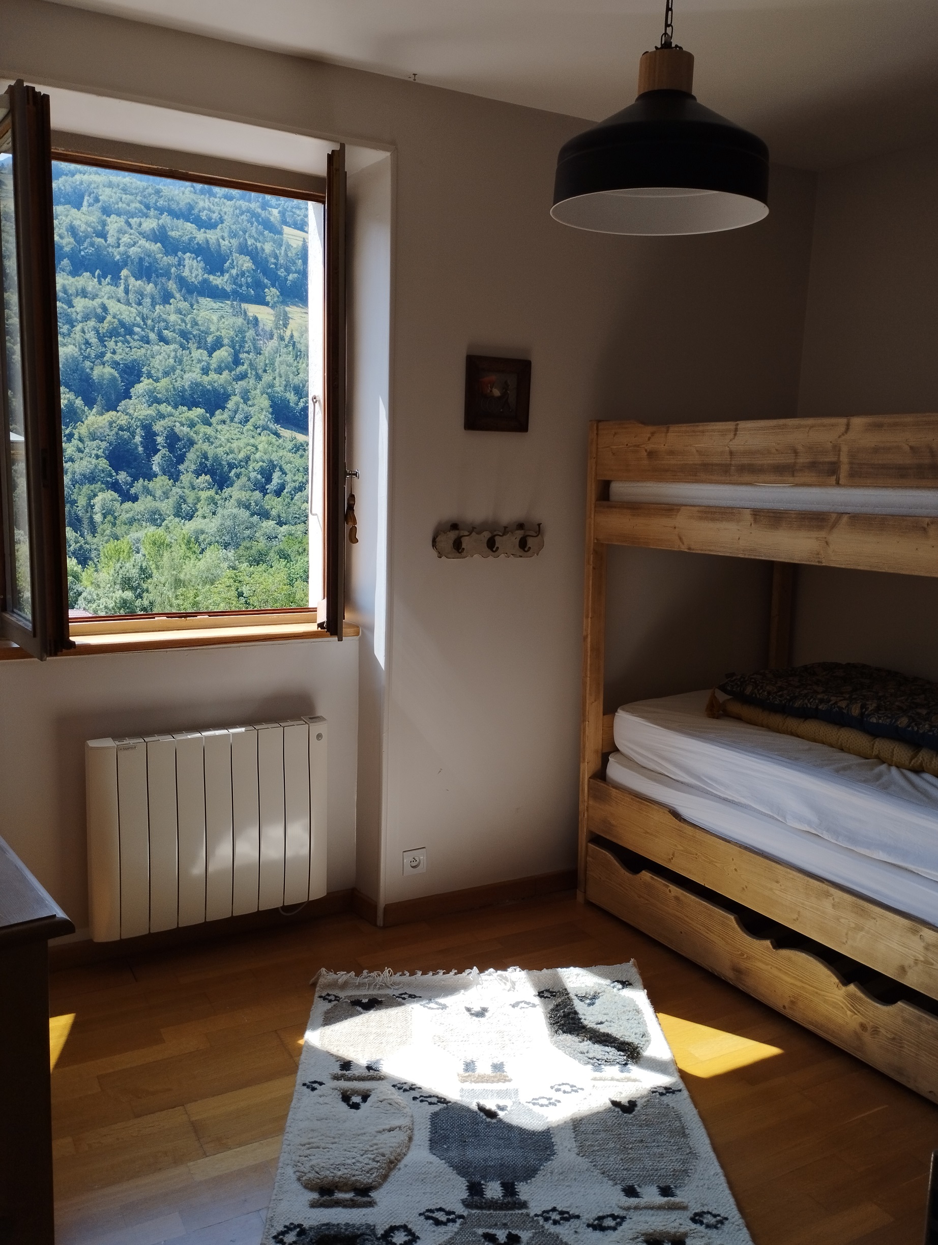 - Deuxième étage : 2 chambres et une salle d'eau. La chambre d'enfants comporte un lit proposant 3 couchages. La chambre "parentale" comporte un lit 2 places de 140. Les coussins, les draps et les couvertures sont fournies ainsi que les serviettes, les gants, les torchons. Des savons (douche / shampoing) Bio sont mis à votre disposition.