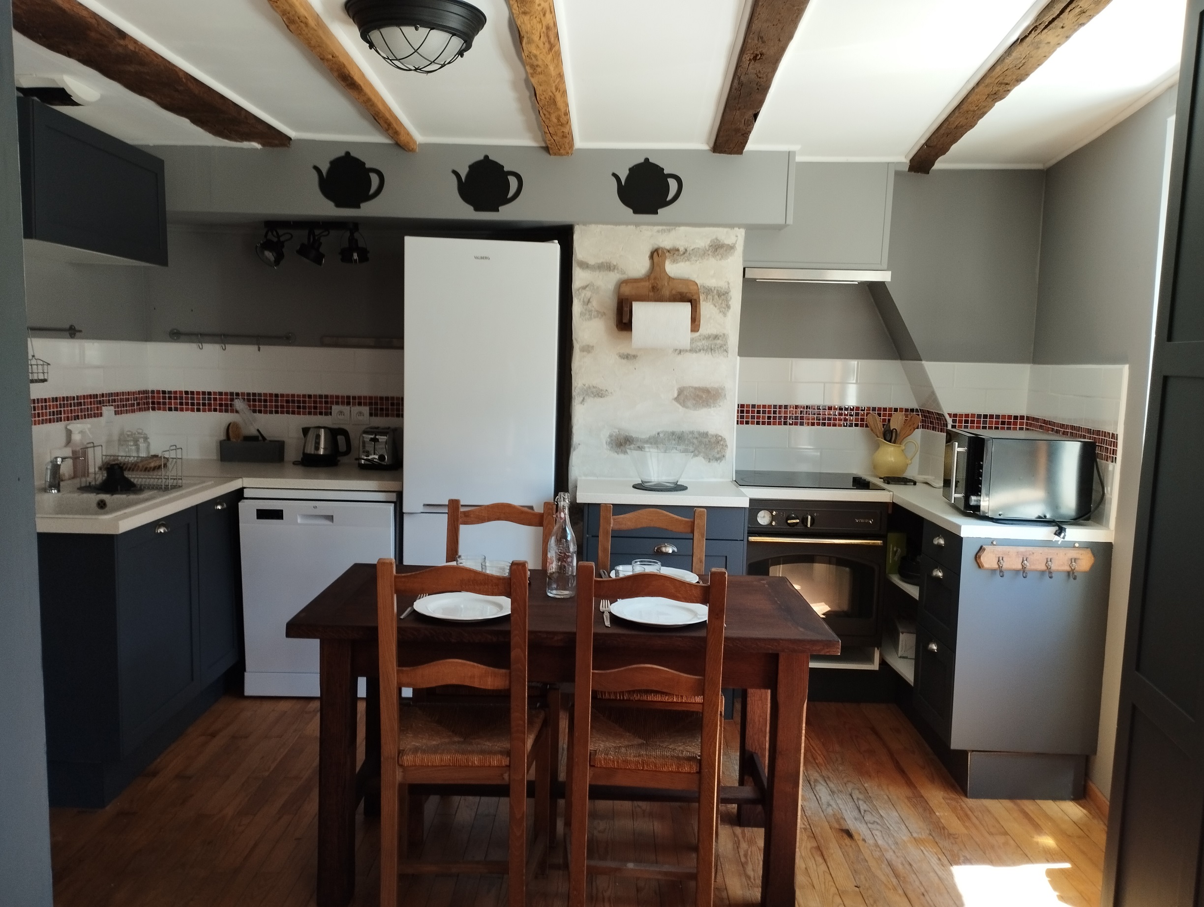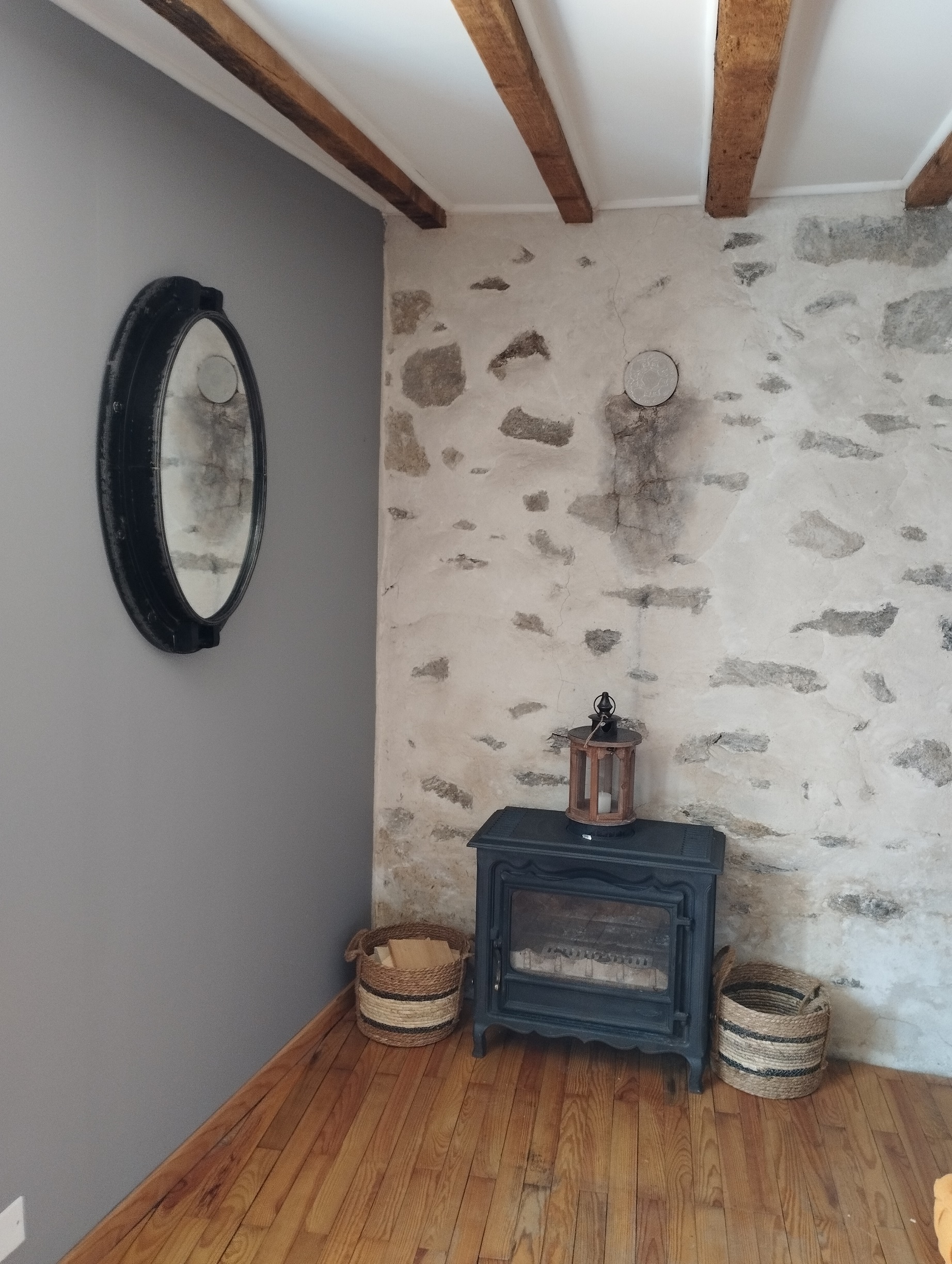 - Premier étage : petite cuisine donnant sur le patio et ouverte sur un salon trés cosy aux couleurs chaleureuses et élégantes dôté d'un poêle à bois qui sera en service dès cet hiver. Soirées chaudes au coin du feu assurées ! La cuisine est trés bien équipée (four traditionnel / micro-ondes, réfrigérateur, congélateur, bouilloire, grille-pain, crêpe party, service à fondue...).