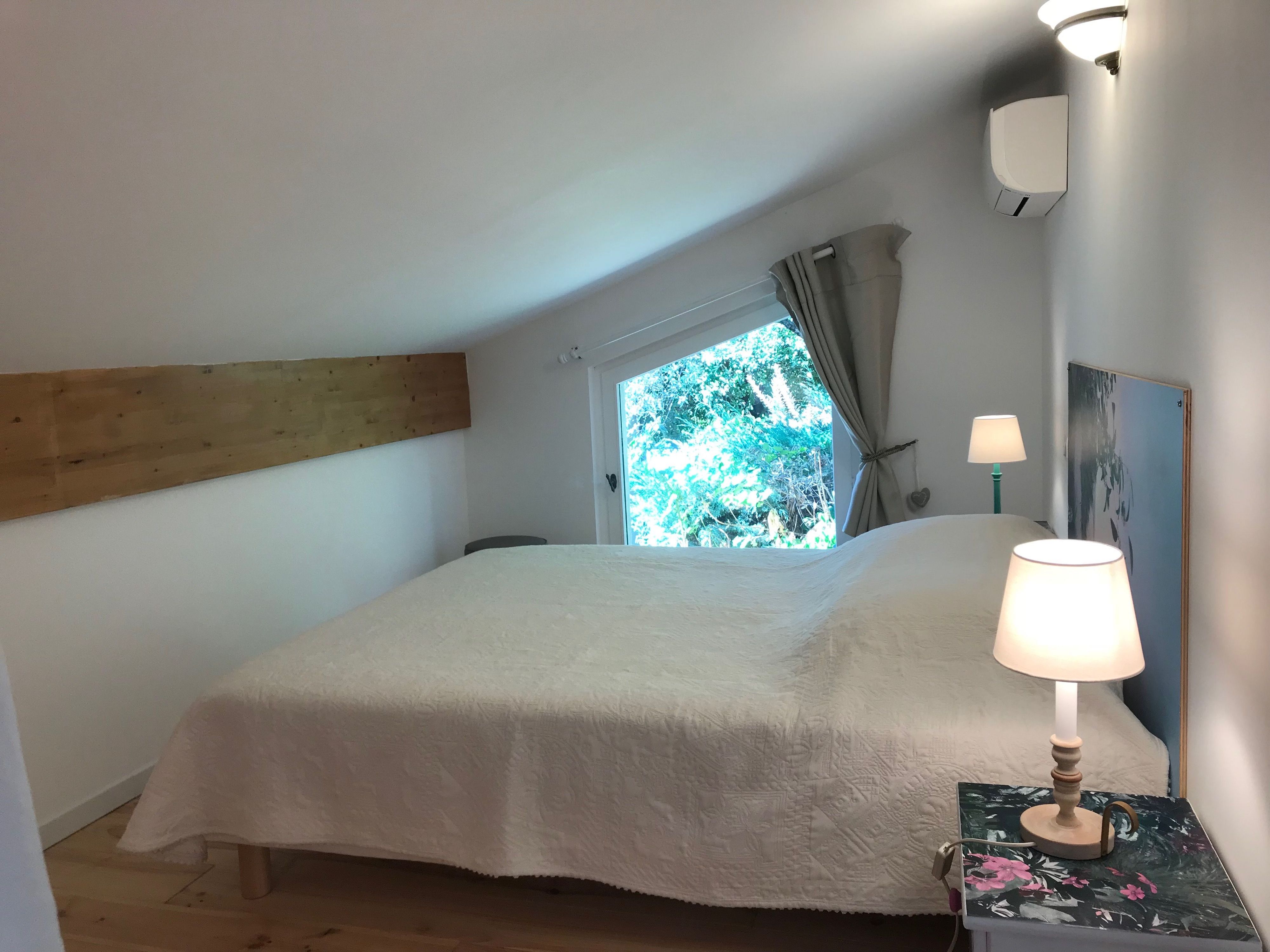 Il dispose d'une salle d'eau privative avec douche à l'italienne et toilettes dans la salle d'eau, d'une cuisine ouverte équipée, d'une chambre en mezzanine à l'étage avec un lit double de 160cm et climatisation ainsi que d'un salon bibliothèque.