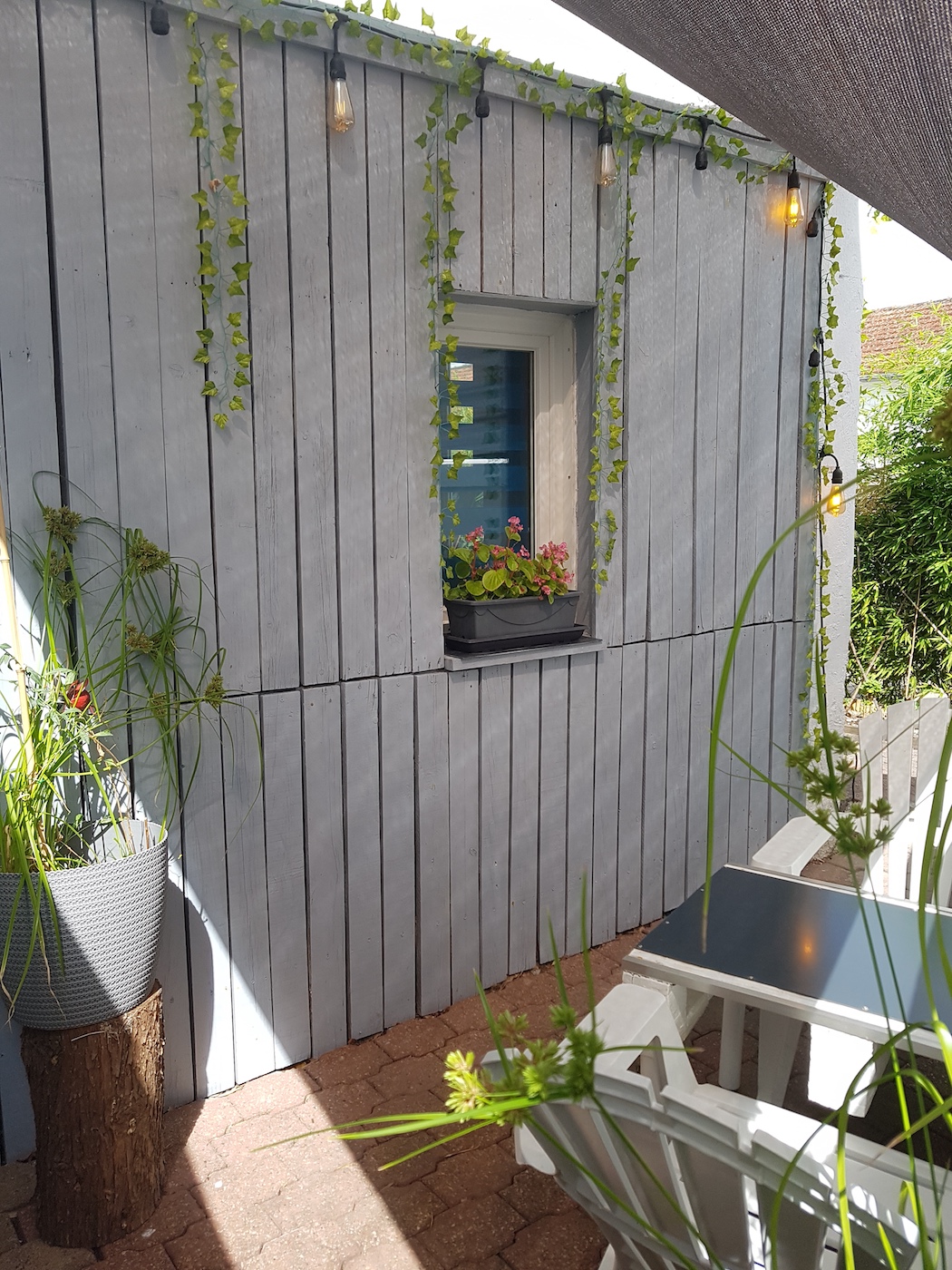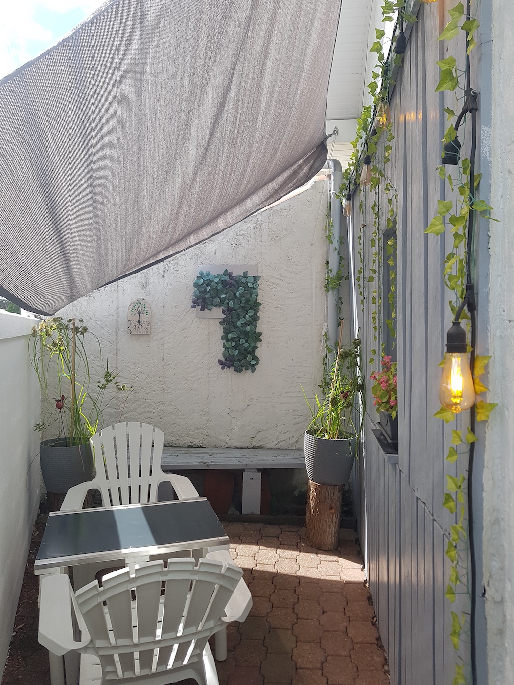 La cour privée est entièrement fermée par un portillon en aluminium et aménagée pour votre détente avec des fleurs, un patio avec un voile d'ombrage, une guirlande électrique d'extérieure avec des ampoules à leds,une petite table, avec deux chaises de détente,une autre petite table avec deux chaises.