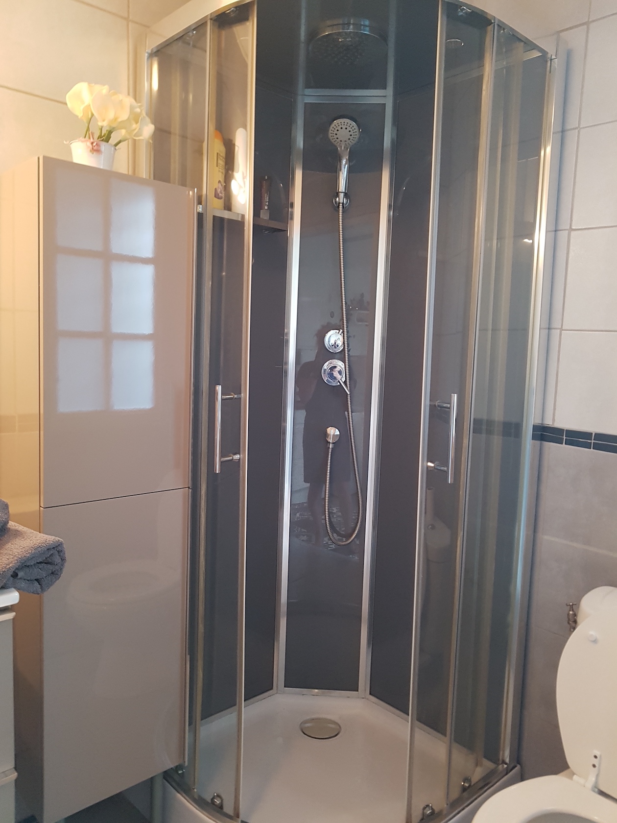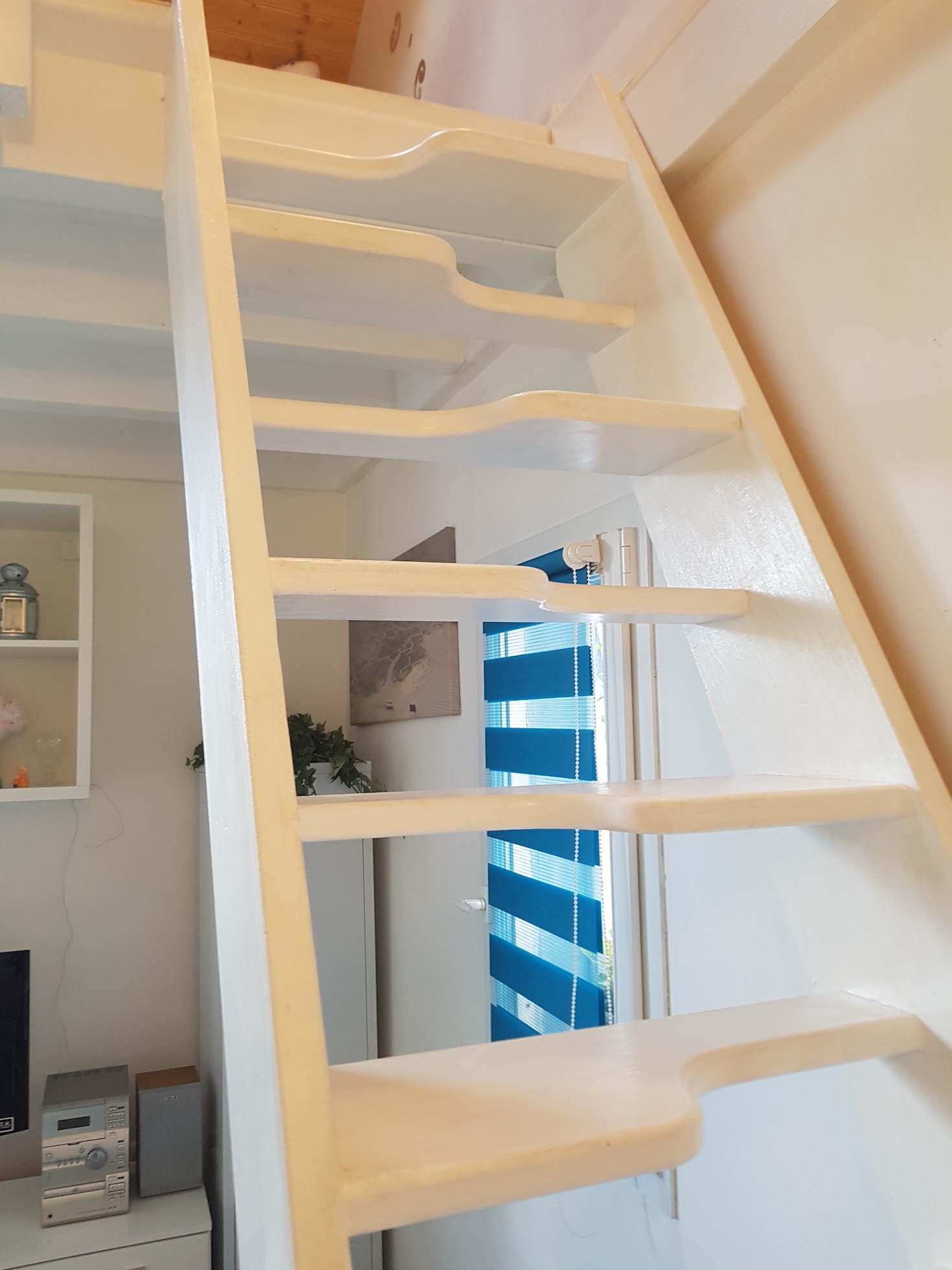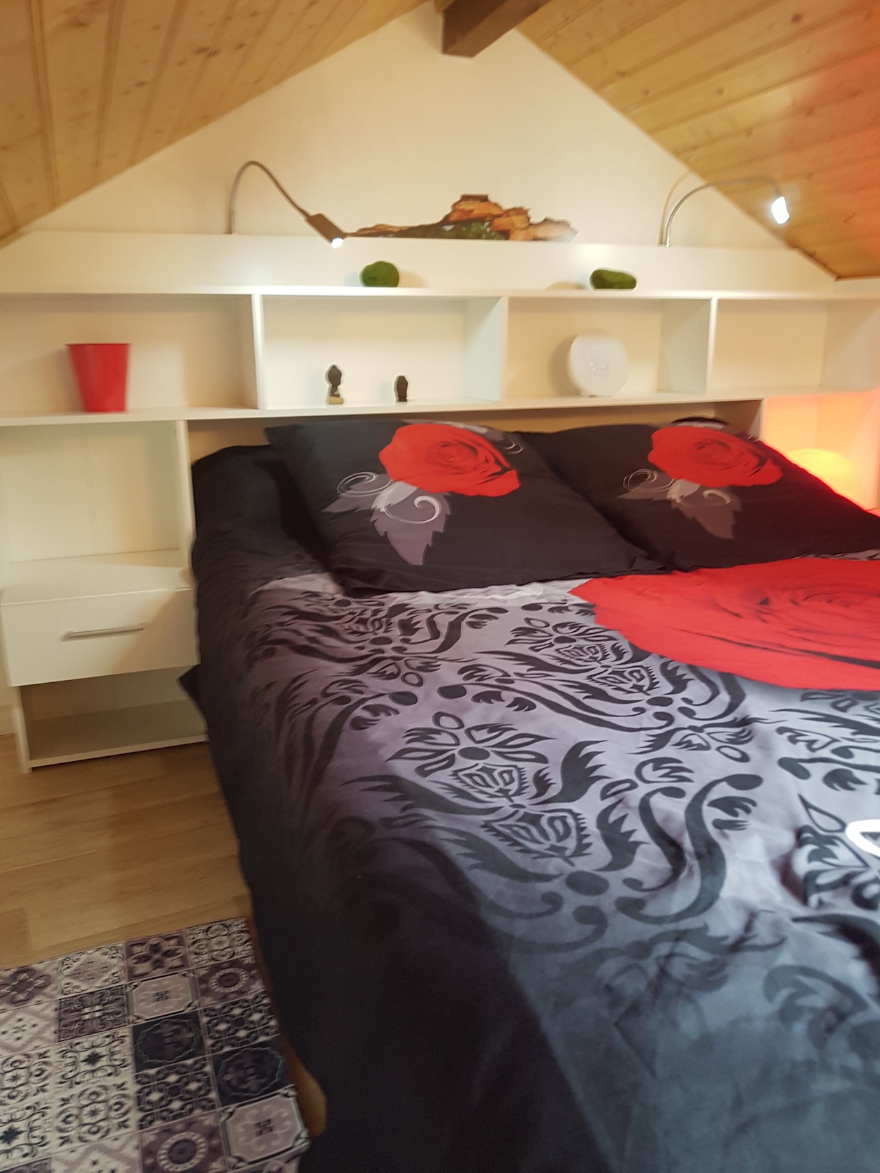 La salle d'eau est équipée d'un meuble vasque avec rangements, une colonne avec étagères, une cabine de douche et wc.La mezzanine de couchage est accessible avec un escalier à pas décalés et comprend un vrai lit en 140, une tête de lit intégrée avec étagères,tables de nuit avec lampes à leds intégrées,un velux avec sore occultant.