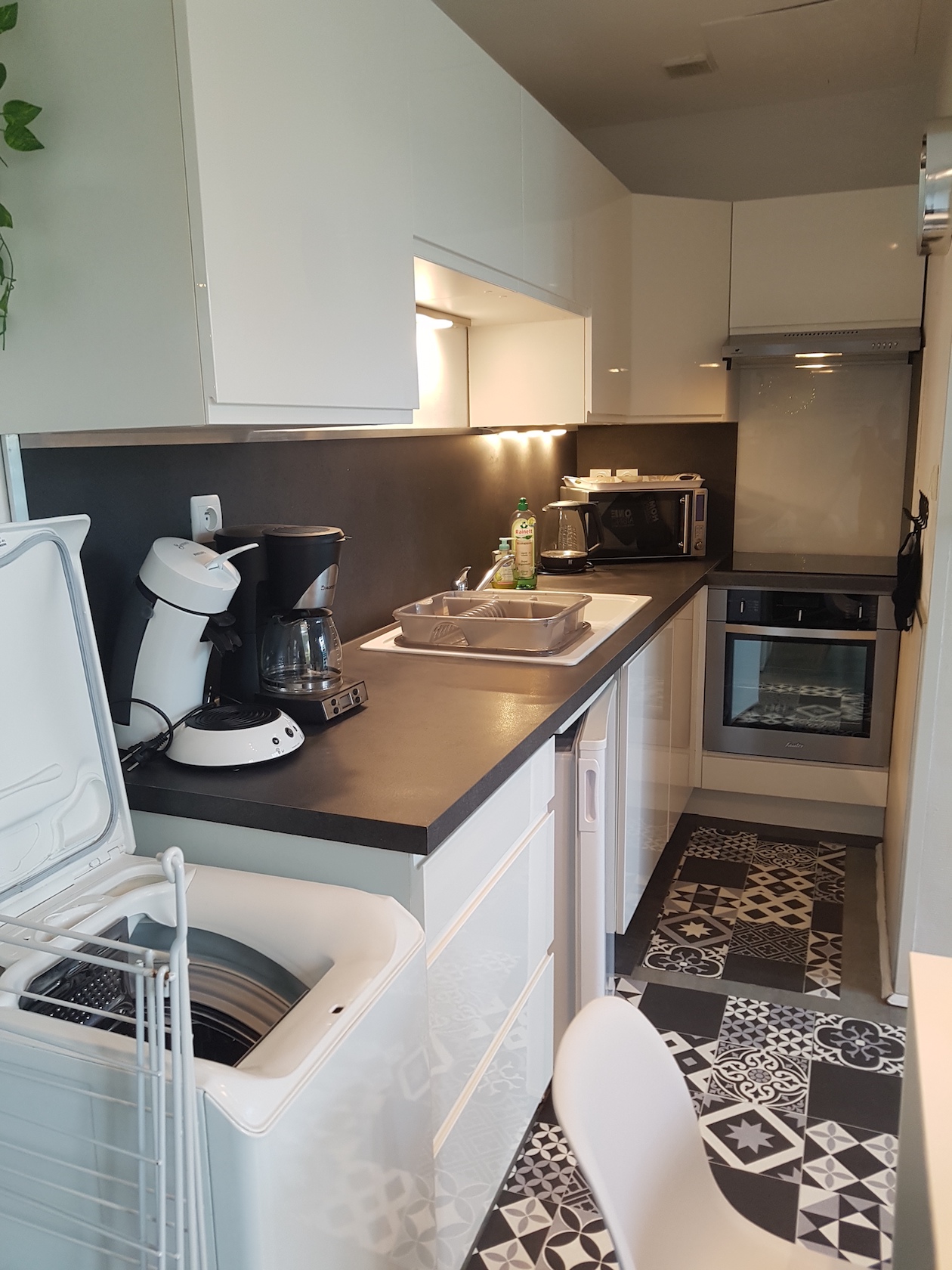 La cuisine est entièrement équipée avec des plaques vitro-céramiques, une hotte,four à micro-onde,four à pyrolyse, cafetière senséo et traditionnelle, bouilloire,vaisselle,linge de cuisine,machine à laver,fer et table à repasser,étendoir à linge.