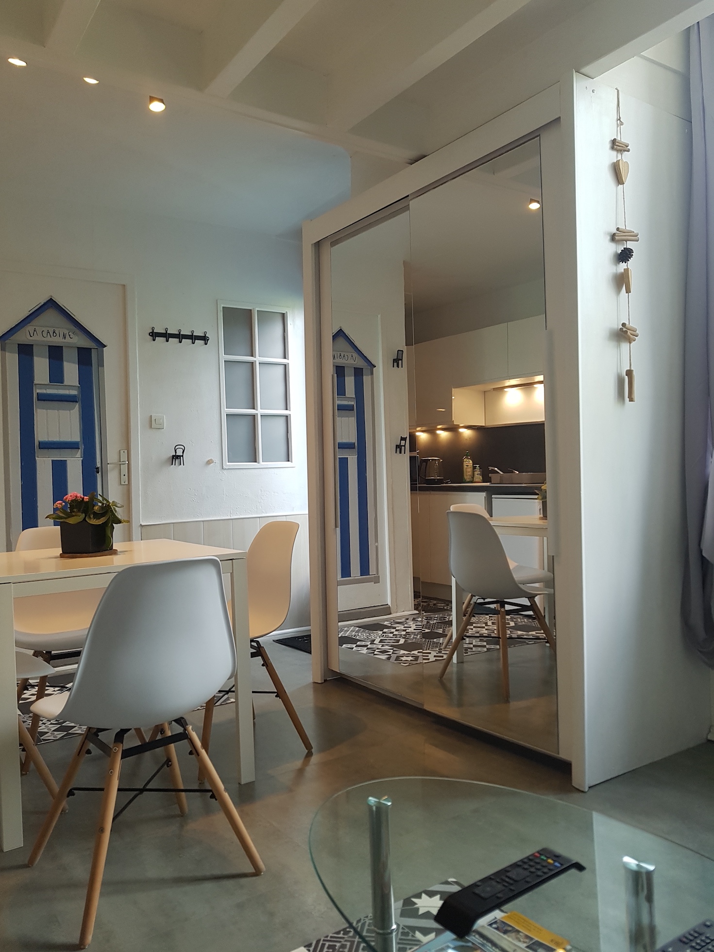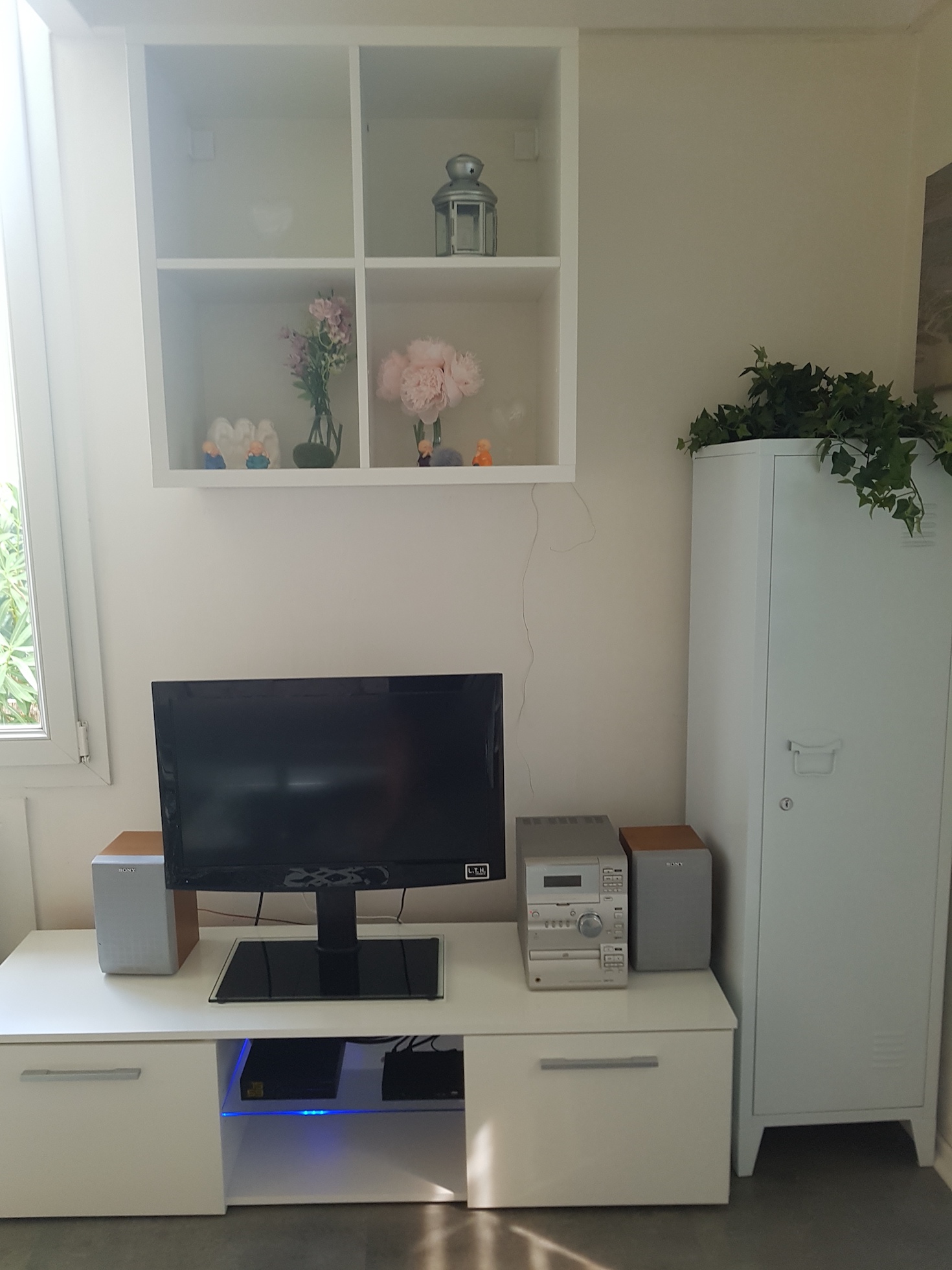 Le salon comprend un canapé convertible,une table de salon,une télévision HD avec meuble avec rangements,une freebox pop, une petite chaine hifi, une armoire avec miroir.
