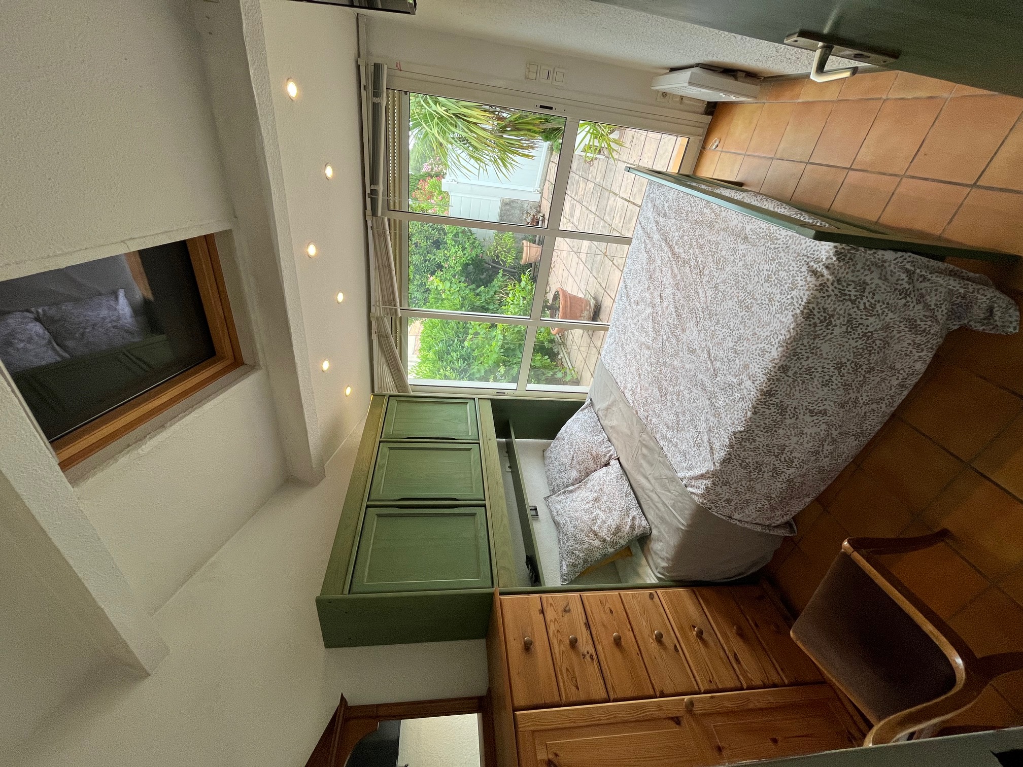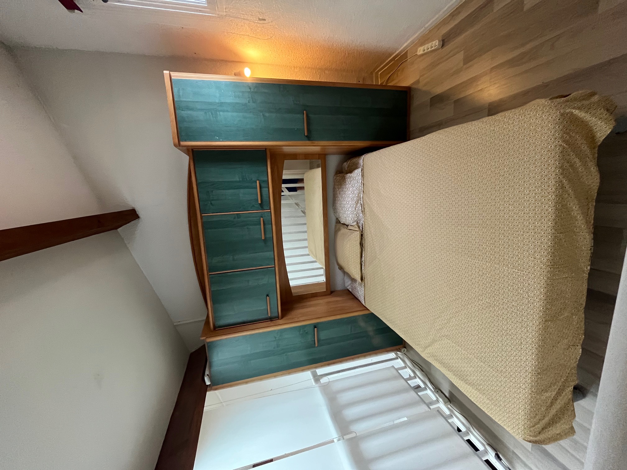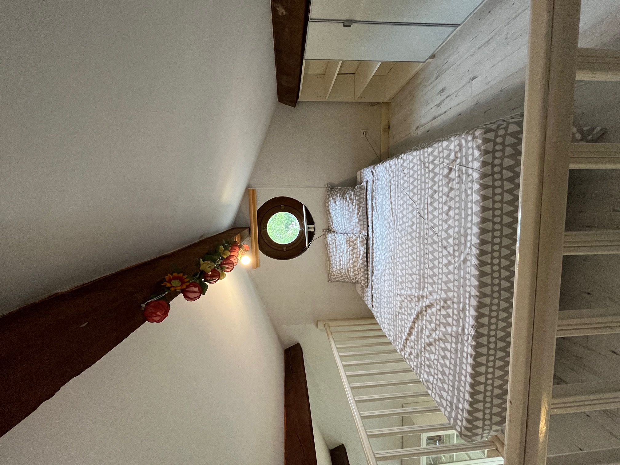 La deuxième chambre fermée possède un lit double avec télévision, velux et accès au jardin arrière.