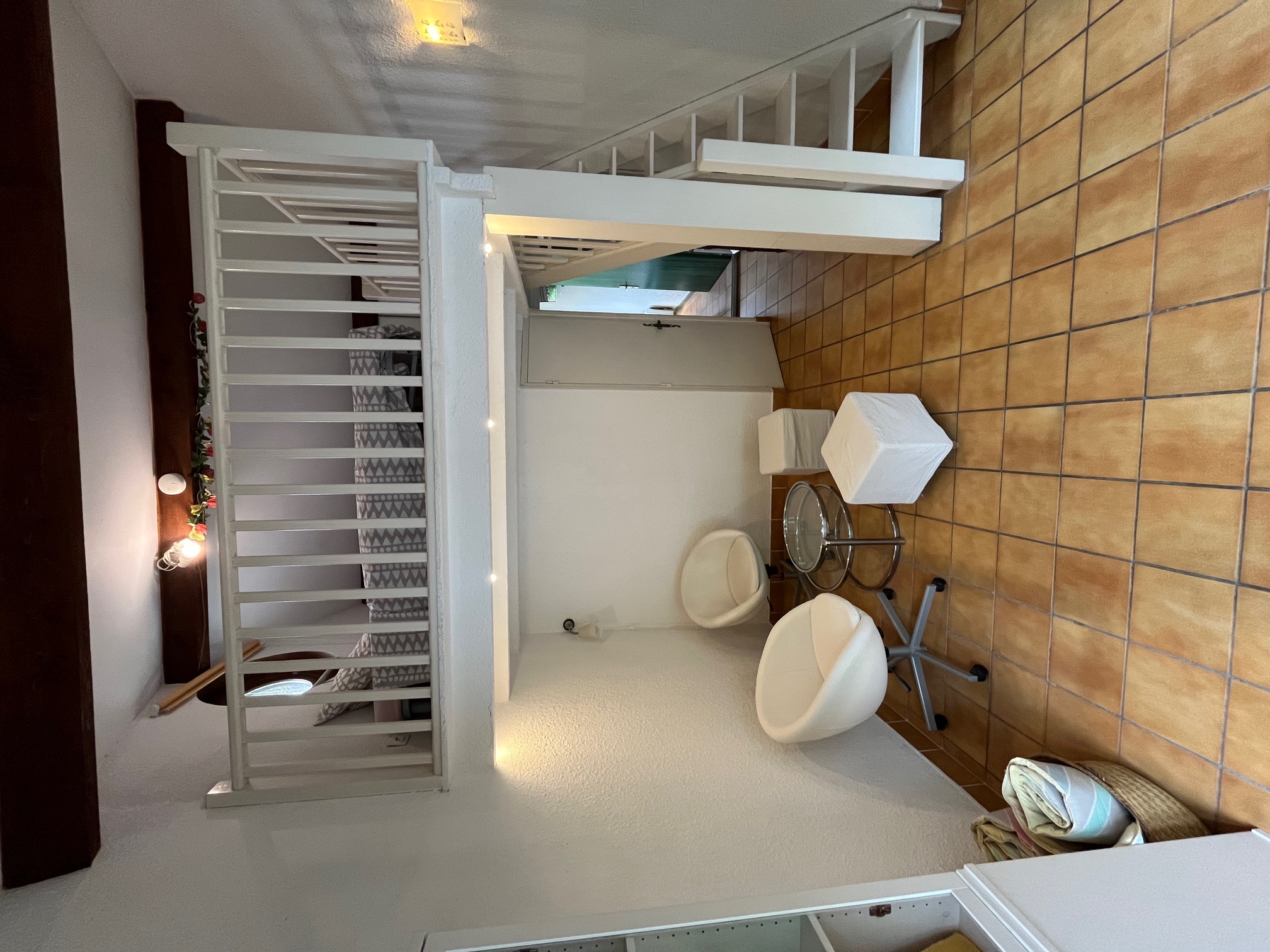 La maison possède une véranda avec télévision, climatisation et deux velux, puis d'une salle à manger reliée à une petite cuisine ouverte et une mezzanine avec un lit double "clic-clac".