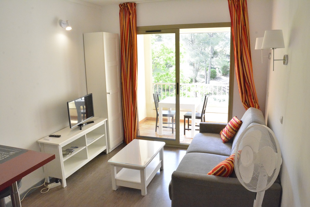 Salon avec canapé convertible Rapido neuf, télévision, wifi gratuit, salle de bain avec WC, balcon