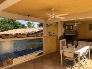 Une cuisine d'été munie d'un barbecue et d'un ventilateur plafonnier