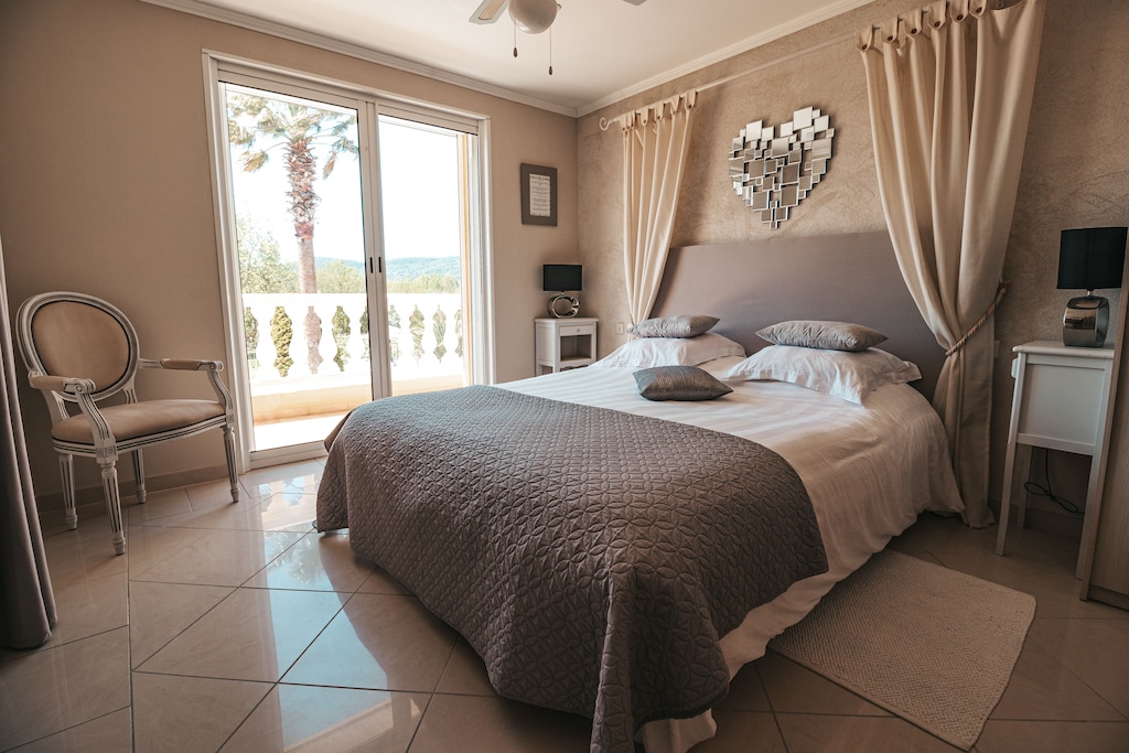 Une suite parentale équipée d'un grand lit de 160 cm avec balcon, une douche, une baignoire à remous et un WC, ainsi qu'un ventilateur plafonnier et un climatiseur.